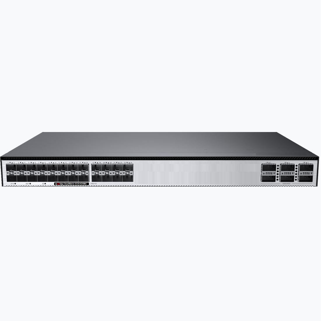 CloudMatrix 6530-H系列交换机包括CM6530-H24X6C和CM6530-H48X6C两个产品型号,其中: CM6530-H24X6C支持24 个万兆 SFP+,6 个 40/100GE QSFP28;可插拔双电源,支持 1+1 备份;CM6530-H48X6C支持48 个万兆 SFP+,6 个 40/100GE QSFP28;可插拔双电源,支持 1+1 备份。